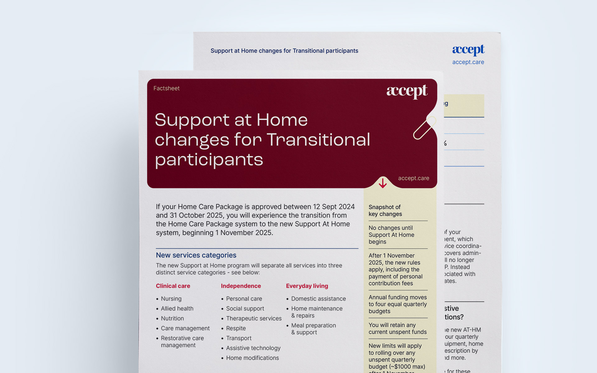 This factsheet on Support At Home changes for Transitional Participants is a great start to getting clear on what to expect, with information on the new service categories, co-contribution rates, key changes and your commonly asked questions, answered!